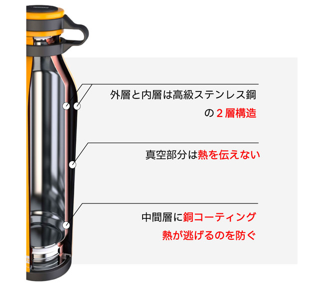 『b-evo』ボトルは2層構造に加え銅コーティングを施した3層真空断熱構造になっています。まほうびん検査もクリアし、国内でも保温・保冷力が認められています。