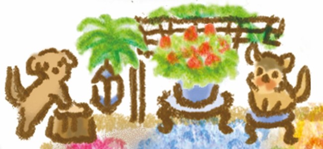 ワンちゃんがフラワーガーデンを背景に写真を撮れる切り株のフォトスポットを用意。