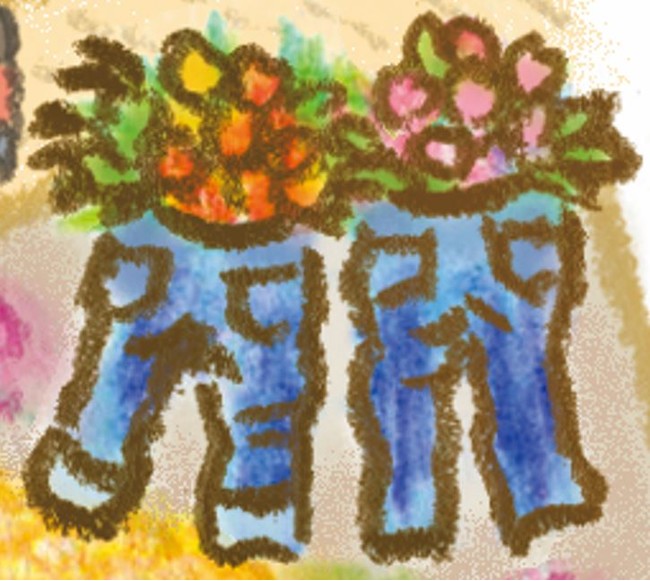 履けなくなったジーンズに土を詰めて花を植え込みます。
