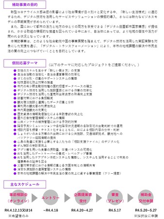 本補助事業は、このような社会動向や国の事業展開を踏まえて、デジタル技術を活用した実証実験を対象にした支援を通じ、「DX」により、本市の地域課題の解決や市民生活の質の向上につなげていくことを目的とします。
