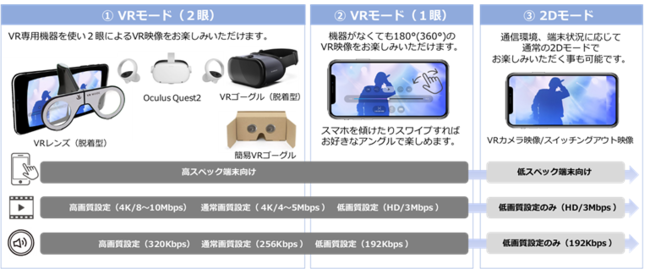 VR配信視聴は、VR配信視聴専用アプリ「VR MODE」をダウンロードしご覧いただけます。 (アプリダウンロードには、iOS 端末・Android 端末・Oculus Quest 2のいずれかの端末が必要となります)