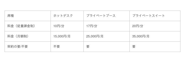 <「JustCo Zone」席種/料金体系>