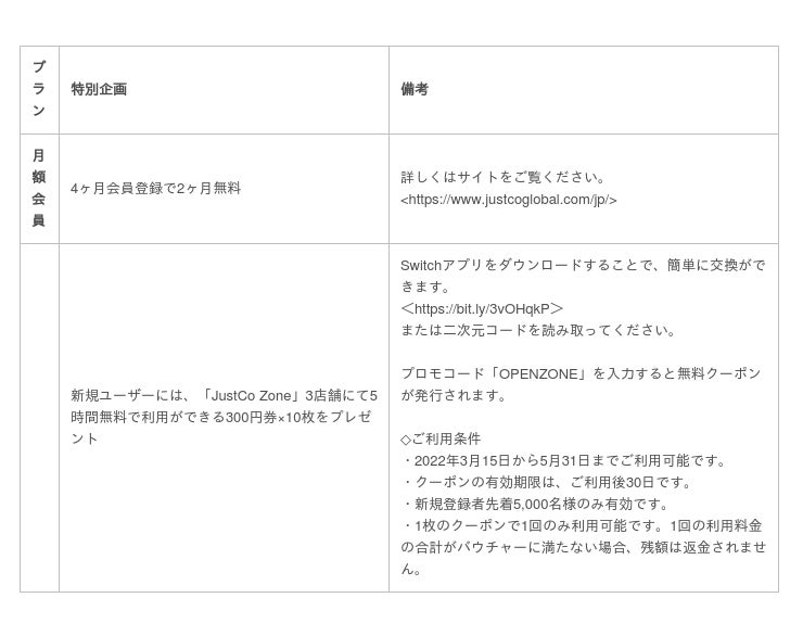 オープニング特別企画として、「JustCo Zone」新規利用者に最大5時間分の無料クーポンを提供いたします(先着5,000名様限定)。