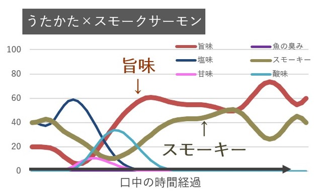 グラフ縦軸は印象的な味覚の選択率(強さに相関)、横軸は口に含んでから飲みこんだ後の余韻までの時間経過を表しています。