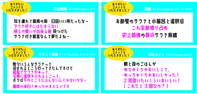 ご宿泊いただいたサウナ好き芸能人の方々からのコメント