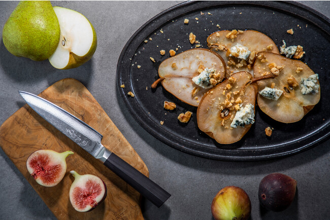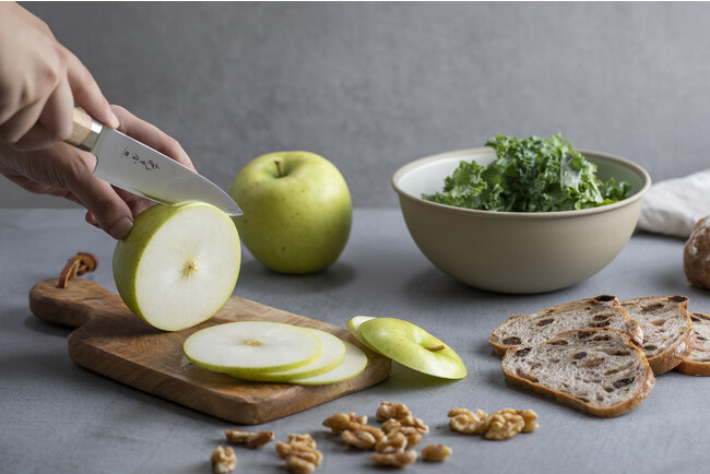 鎚目が特徴の37層鋼は、和の要素を感じさせながらも、伝統によりすぎない軽やかさと清潔感があるデザインで個性が際立ちます。(写真:あすか 37層鋼 ペティナイフ 14,300円(税込))