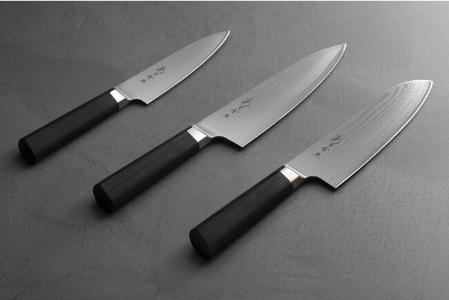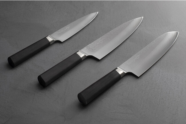 2022年、創業90周年を迎えたヤクセルは、次の100周年に向けた幕開けとして、高級包丁ブランド『あすか』を開発いたしました。創業時から培った職人の技と、新しい技術を掛け合わせることで実現する、ヤクセルにしか造れない包丁です。『あすか』には、3層鋼、37層鋼、69層鋼の3ラインがあり、用途に合わせて最適なものを選ぶことができます。どのタイプも芯材にはVG10を使用し、サブセロ加工によって鋭い切れ味を実現しました。ハンドルはだれの手にも馴染むヤクセル独自のデザインです。また、家庭での使いやすさにこだわり、サビに強く、耐食性にも優れた材質を採用しています。さらに、研ぎ直しもしやすく、メンテナンス性も良い包丁です。
