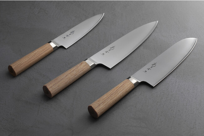 普段使いしやすい3層鋼は、毎日の料理が楽しくなるナチュラル&シンプル。温かみのある白木ハンドルが目を引ひきます。(写真:あすか 3層鋼 三徳包丁 14,300円(税込))