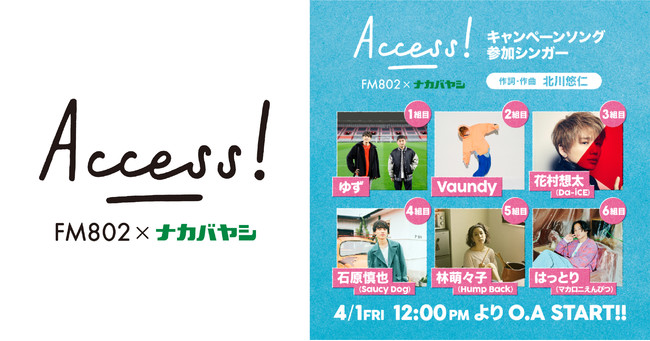 FM802×ナカバヤシ ACCESS! キャンペーンは、FM802とゆかりあるアーティストが多数参加するオリジナル・キャンペーンソングを制作するドリームプロジェクト。この、オリジナル楽曲は毎年期間限定でFM802で独占オンエアしています。