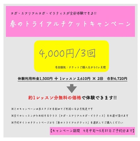 現在、Studio Asileでは新規にお越し頂くお客様に対して「春のトライアルチケットキャンペーン」を行っています。