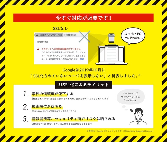 Google社から「Chromeでは混合コンテンツをブロックする」という発表(※4)もされていることから、SSL化されていない多くの学校サイトが閲覧できなくなり、さらに通信が暗号化されていないため個人情報漏洩などのリスクにも脅かされています。SSL化対応は火急の事項であり、対応を行わないと学校の信頼度低下にも繋がりかねません。