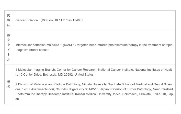 本研究の論文「Intercellular adhesion molecule-1 (ICAM-1)-targeted near-infrared photoimmunotherapy in the treatment of triple-negative breast cancer.」は「Cancer Science(インパクトファクター:6.716)に2022年6月20日(月)付で掲載されました。