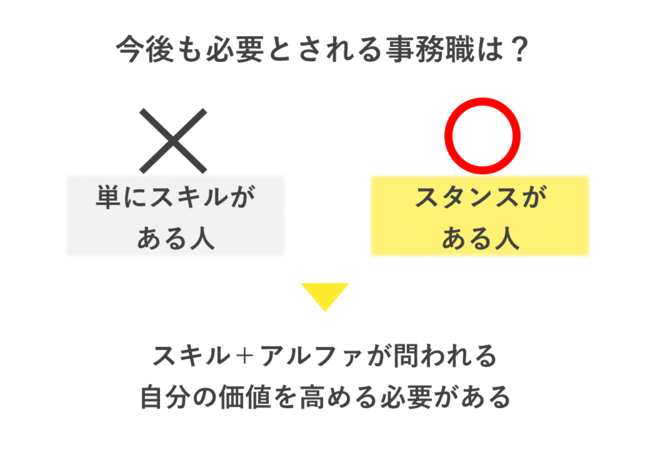 今後の事務職には「スキル・知識」の向上が必要ですが、何より重要で仕事の成果に影響するのは「スタンス」だと考えています。