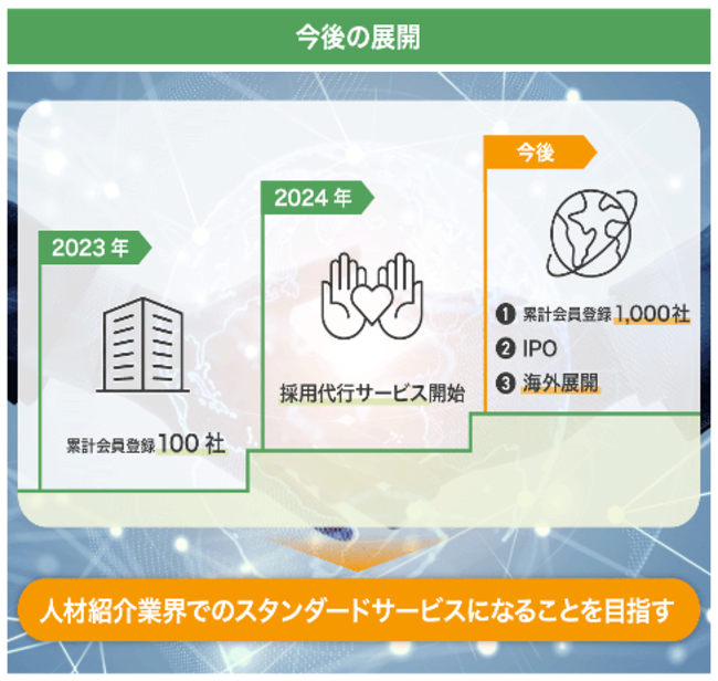 また、プラットフォームで構築されたエージェントのネットワークを活用し、求人企業の「採用代行サービス」も実現するとともに、海外エージェントとも連携しながらグローバルに「AGENT SHARE」を展開していくことで企業として成長してまいります。