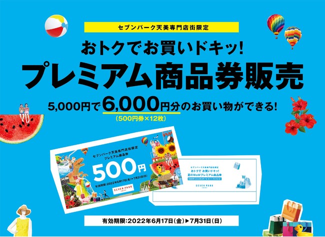 また、期間中お得に商品を購入できる「プレミアムチケット」の販売や、初開催となるフリーマーケット「セブンパーク天美 de フリマ」なども開催。さらに、大型ビジョンを活用したセブンパーク天美ならではの大抽選会「ビジョン de ゴールドチャンス」では、1等景品に「純金10g」や、大型テレビをご用意。2022年7月1日(金)~15日(金)は全館まるごとクリアランス第2弾として、「AMAMI THE BARGAIN ~セカンドインパクト~」を開催。当日ご来店いただいたお客様にしか発見することが出来ない特別なタイムセール「シークレットタイム」や夏グルメの投票キャンペーンも開催いたします。この夏は、お買い物やお食事、エンターテイメントをセブンパーク天美にてお楽しみください。