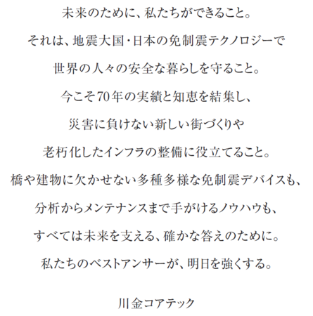 川金コアテックは鋳物工場を起源とし、災害から橋や建物を守る免制震デバイスのスペシャリストとして約70年の歴史を積み上げてきました。世界においても、米国のグループ会社やベトナム工場で事業を進め、欧米、アジアにも製品・サービスを届けてきました。昨今の大規模災害が頻発するなかで、地震大国日本で培った技術とノウハウは、持続可能な街づくりに欠かせない安心安全のコアテクノロジーとして、その重要性が高まっています。さらに、日本国内においては、持続可能な街づくりが進むと同時に老朽化したインフラの保全・補修が社会課題となり、特に橋梁業界では「大メンテナンス」の時代と言われています。創業時とは異なる社会的要請にお応えするためにも、新たなブランドビジョンを策定し、新生川金コアテックとして生まれかわることを発表しました。
