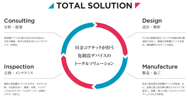 川金コアテックは現在のものづくりから社会インフラを支える免制震デバイスに関するあらゆるニーズにワンストップで最適なソリューションを提供する「トータルソリューション」へと事業の幅を拡大します。どのようなデバイスがふさわしいのかという分析から設計、品質と施工性を兼ね備えた製造、安全の維持には欠かせないメンテンナンスや診断に至るまで、あらゆるお悩みに「かかりつけ医」のような存在として、川金コアテックだからこそ出せるベストアンサーをご提供します。