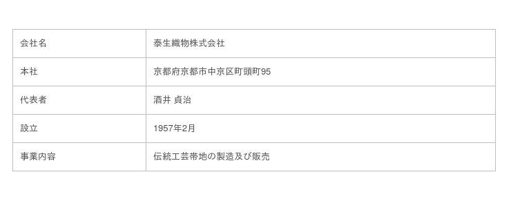 泰生織物株式会社(本社:京都市中京区、代表者:酒井 貞治)は、江戸時代から脈々と培ってきた京都西陣織の伝統工芸帯地のトップブランド「泰生織物」に加え、この度 自動車内装表皮分野で、その伝統を受け継ぐブランド「TAISEI(タイセイ)」を立ち上げます。