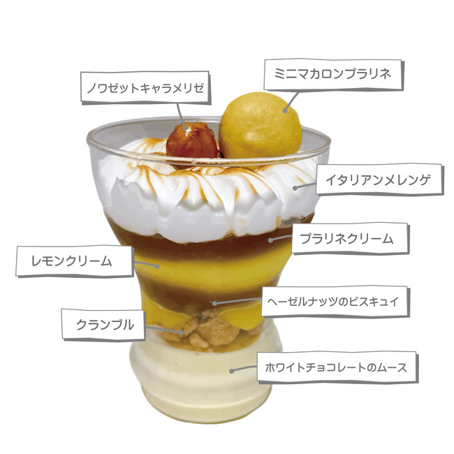 メレンゲのなめらかさ、シトロンの爽やかさと濃厚なプラリネクリームによる本格的なフランススイーツをお楽しみください。
