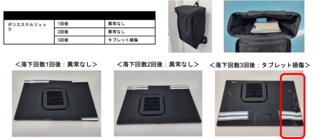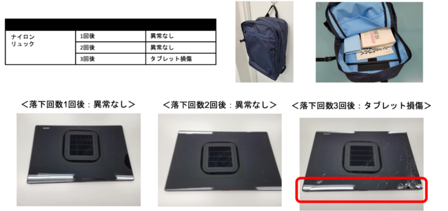 この実験は、近年小学校におけるタブレット教育が普及するなかで、子どもがカバンを落とした際にタブレットにどのような衝撃があるかを検証するために実施しました。