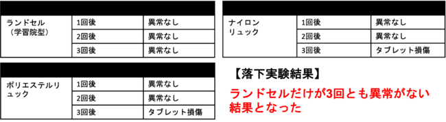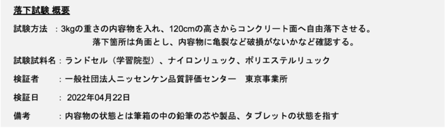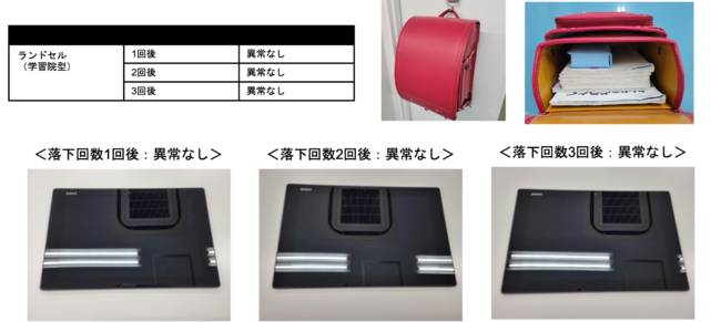 一般社団法人日本かばん協会に属するランドセル工業会は、ニッセンケンと共同でランドセルやナイロンリュック、ポリエステルリュックなどの学生鞄に3kgの内容物を入れ、120cmの高さから落下させて内容物に亀裂や破損がないかを調べる落下実験の結果を行いました。