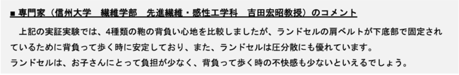 ランドセル工業会としても、もっとランドセルが子供たちの安全で快適な学校生活をサポートするにはどうしたら良いのか、日々実験と試行錯誤を繰り返しております。ナイロン性やポリエステル素材など、工業会に所属する製造メーカーも過去に検討を行ってきました。一方で、今回の検証データも示している通り、子どもの安全性また体への負担の両面からみて、現在のランドセルが最適であると考えています。