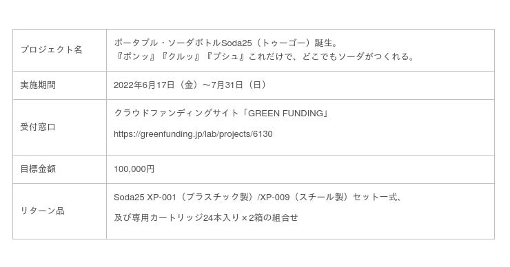 【「Portable Soda Bottle Soda25」クラウドファンディング概要】
