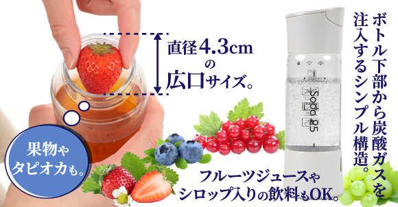 ・ボトル下部から炭酸ガスを注入するシンプル構造なので、フルーツジュースやシロップ入り飲料も大丈夫。