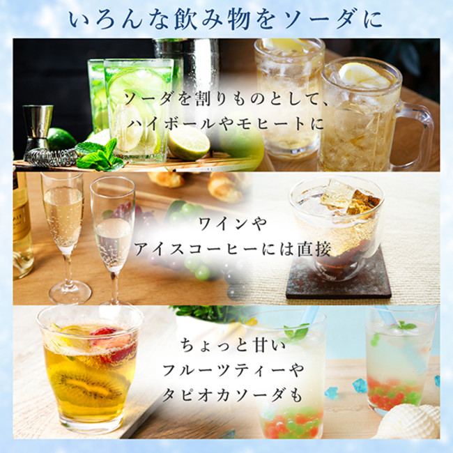 水、ワイン、お茶、コーヒー、フルーツジュースは勿論、果実やタピオカ入りの飲料もソーダに。