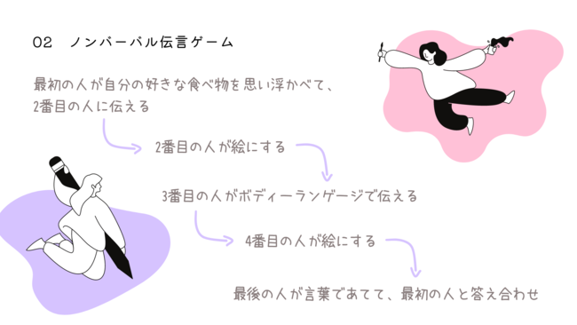 言葉を使わない伝言ゲームを考案しました。順番に次の人に伝えていき、最後の人が理解したものと最初の人が思い浮かべたものが一致していれば成功となります。失敗しても成功しても、大変盛り上がりました。母国語が異なる生徒たちの間の普段のコミュニケーションが表れており、講師を務めた代表の松尾は、コミュニケーションは言葉だけでないこと、相手目線を想像することがミソとなることを伝えました。