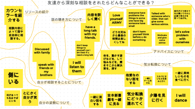 ストレスの対処法に正解はなく、まず対処法をたくさん持つことが大切と説明したうえ、「友達から深刻な相談をされた」状況でどんな対処ができそうかブレーンストーミングを行いました。母国語で表現して翻訳し、そのまま貼り付けて全員で見れるように、オンラインホワイトボードを活用しました。ユニークな対処法が次々と出て、自分では思いつかなかったアイデアを知って考えが深まった生徒もいた様子でした。