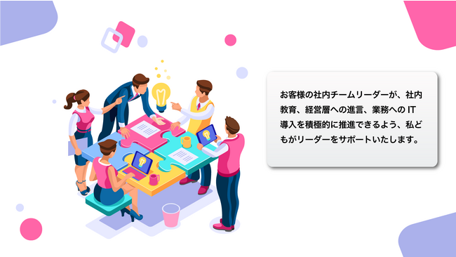 従業員が自らの業務にITツールを活用する力をつけるために、課題発見から解決までを自身で行っていただきます。 実際に進める中で生じた疑問や悩みごとに対して、適切なアドバイス・支援を行い、従業員自身によるIT活用力アップを目指します。自社でDX推進を持続する仕組みを定着させます。