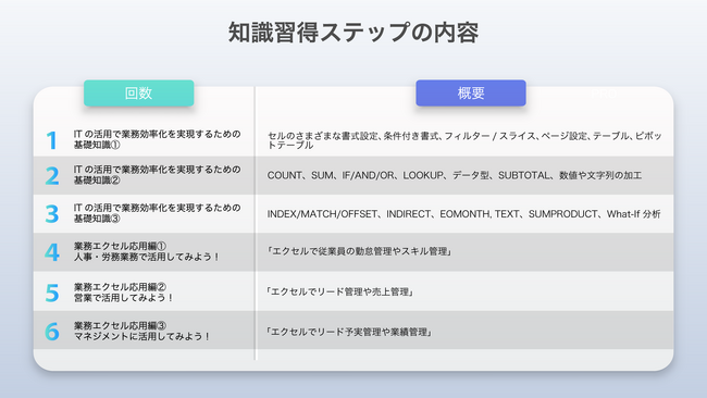 「ITをビジネスや業務に活かす」ことを目標として、慣れたエクセルを題材とすることで、ツールの使い方に気を取られることなく、活用ノウハウの習得に集中できます。