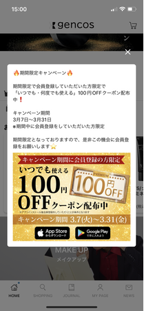 公式アプリのリリースを記念して期間中に登録を頂いた方限定で、ショップ内(https://shop.gencos.jp)で何度でも使用可能な「100円OFFクーポン」を配布いたします。