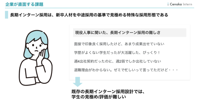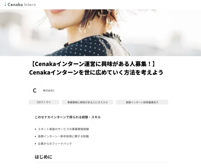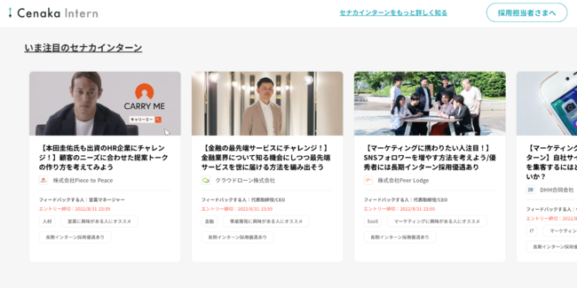 株式会社C(東京都港区、代表取締役:井端 裕輝)は、この度「インターンシステム」として特許を申請し、次世代インターン掲載サイト「Cenakaインターン(セナカインターン)」のテストリリースを2022年8月2日に開始しました。