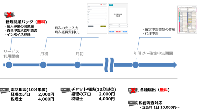 また、チケットを購入することでチャット・電話による税務相談や税理士による届出書の作成等のサービスもオプションとして利用可能です。
