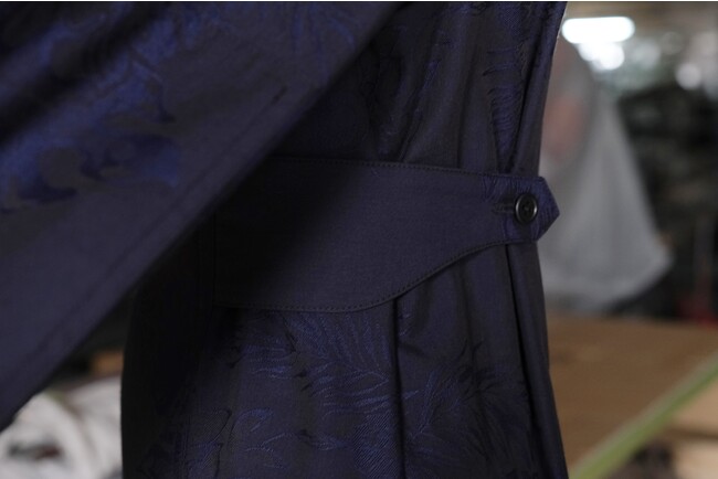 ウエストにシルエットの調整用のアジャスタタブを設け、お客様の要望に合わせてボタンを縫い付ける位置を変更することで、より着る人の体に合わせられる仕様に。