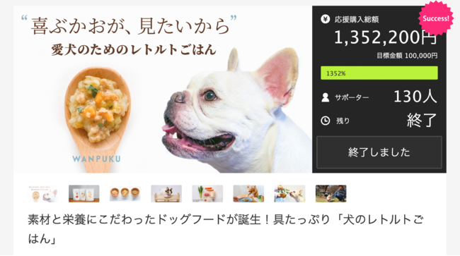 2022年5月より開始したクラウドファンディング(https://www.makuake.com/project/wanpuku/)では設定目標額を開始1分で達成し、最終日の6月25日には支援金額135万円、支援者130名、目標達成率1352%という目標金額を大幅に上回る結果でのゴールとなりました。