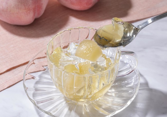 白桃ジュレは、瑞々しさをお愉しみいただけます。白桃の果肉もゴロゴロと入っています。