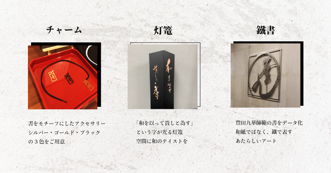 植木鋼材株式会社の技術力と、文部科学省認可公益財団法人日本書道教育学会支局 九華会書道教室 代表:豊田九華師範の作品とのコラボレーションによって、当日の展示会にご参加される方々へ感動を届けるべく、試行錯誤をした結果、さまざまな新商品が生み出されました。