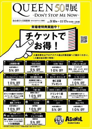 会場最寄り駅・金山駅までの名鉄電車往復乗車券に、『QUEEN50周年展-DON’T STOP ME NOW-』入場券と、名鉄金山駅直結駅ナカ商業施設「ミュープラット金山」で使えるクーポン券、特別車両券(ミューチケット)の割引券2枚がセットになった「名鉄で行く QUEEN展きっぷ」を発売します。