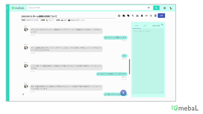 人材の配置転換や離職によるナレッジ損失の問題を受け、mebaL(https://in-modesty.jp/)は2022年7月にサービス提供を開始しました。これまで共有されることが無かった個人の持つ情報やノウハウをmebaLにメモ感覚で蓄積し、組織内で共有することで、組織としてのナレッジ形成を実現することができます。