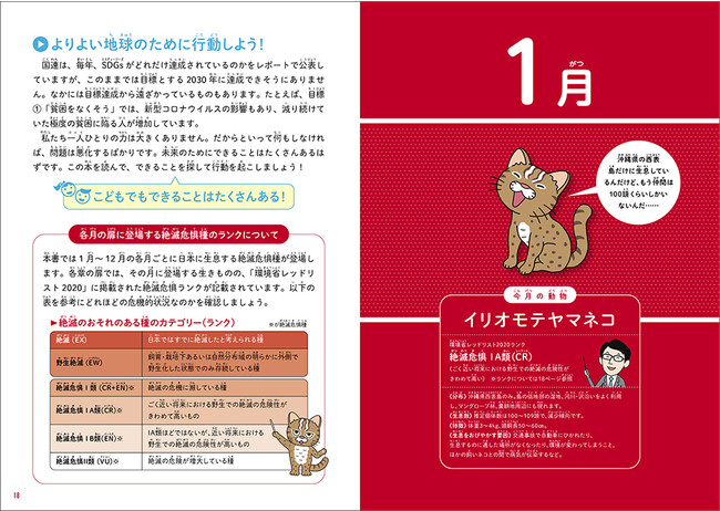 本書では、1月~12月の各月ごとに日本に生息する絶滅危惧種が登場します。飽きずに楽しく続けられます。