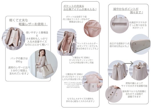 第一弾は今年2月に発売した『働く女性の理想を叶えるお仕事バッグ』で、初回販売分が即完売、続く受注販売でも600点売れるという盛況ぶりを発揮しました。こちらのバッグも今回再販売いたします。