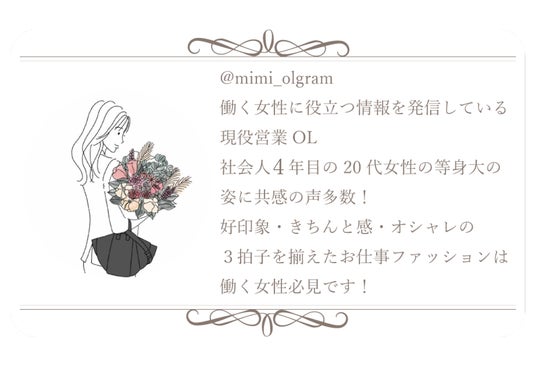 mimiさんは、働く女性に役立つ情報を発信している現役営業OL。社会人4年目の20代女性の等身大の姿に共感の声多数!好印象・きちんと感・オシャレの3拍子を揃えたお仕事ファッションは働く女性必見です。