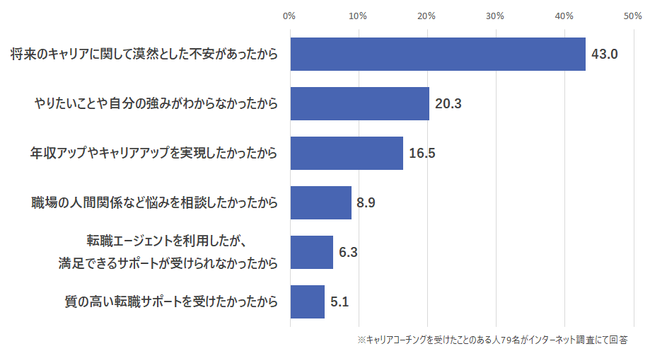 キャリアコーチングを受けたきっかけでもっとも多かった回答は、「漠然とした将来への不安」でした。