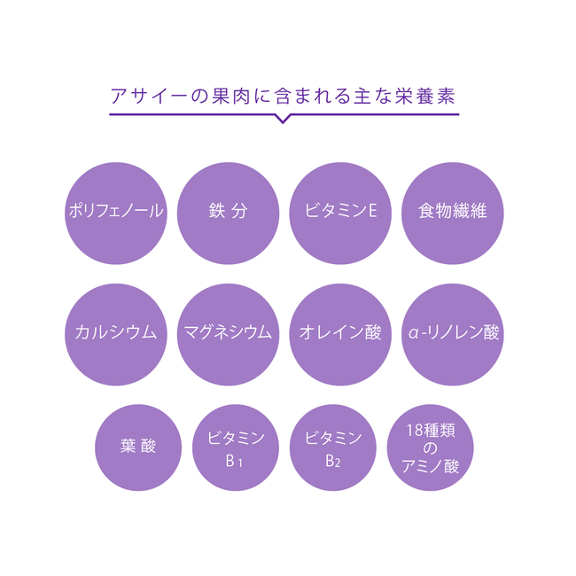 『アサイー×お米の乳酸菌POWDER』の原材料はたった2つ。安心して毎日食べていただけるように、アサイーと米麹のフリーズドライパウダーのみのシンプル処方です。余計な添加物や甘味料は一切入っていません。アサイーフリーズドライパウダーには生プルーンの58倍の鉄分が入っている他、カルシウムやビタミン、葉酸など人のカラダに大切な栄養素が10種類以上も含まれています。