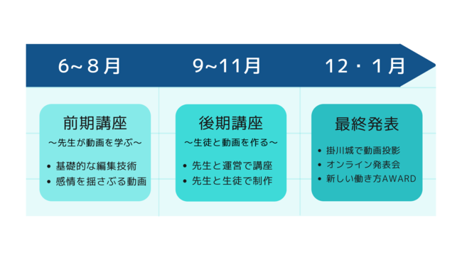 プログラムは全6ヶ月で、前期6~8月の3ヶ月で先生に対するオンライン講座を実施。後期9~12月の3ヶ月で、先生と生徒が一緒になって1つの動画作品を作り上げます。