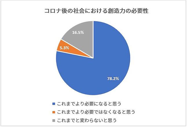 また「コロナ後の社会において創造力が必要」と考えている人は約8割で、変化の大きい環境において創造力が役に立つと考えられています。