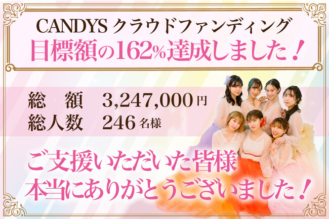挫折を経験したメンバーで結成された大人のリベンジアイドル「CANDYS」は、9月にタイのサイアムパラゴンで行われた『バンコク日本博2022』へ出演をするための渡航費をクラウドファンディングで募集し、当初の目標金額200万円を大きく上回るたくさんのご支援をいただきこのプロジェクトが成功したことをご報告いたします。